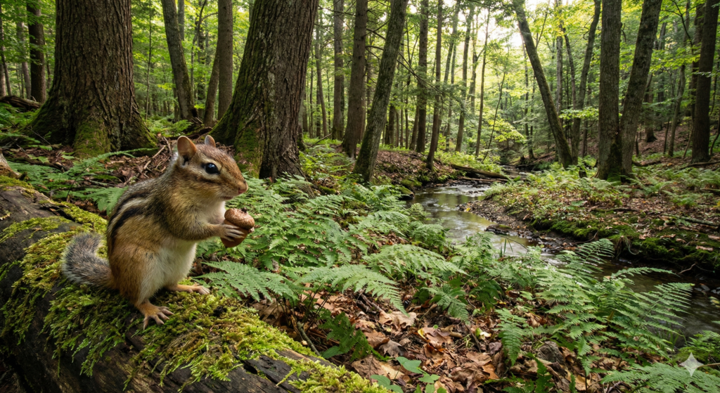 숲속의 다람쥐. 카메라는 다람쥐의 오른쪽 빈 자리를 바라본다.