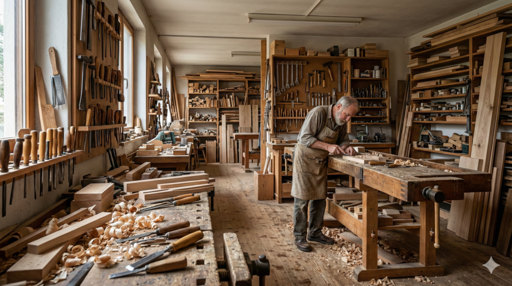 복잡하고 디테일이 풍부한 목공 장인의 작업실 내부 전경, 3분할 구도, 한 명의 장인이 작업대에서 일하고 있으며 화면 오른쪽에 치우쳐 배치됨, 입구 쪽에서 작업실 안쪽 전체를 길게 대각선으로 바라보는 앵글, 카메라 바로 앞의 톱밥과 연장들부터 가장 먼 벽면에 빼곡히 정돈된 도구, 창문으로 들어오는 자연광. 16:9 비례