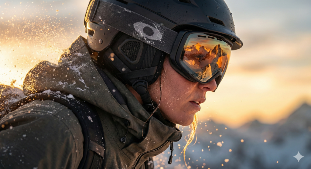 reflection of jagged, sunlit mountains and a fiery sky is detailed in her goggles