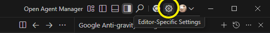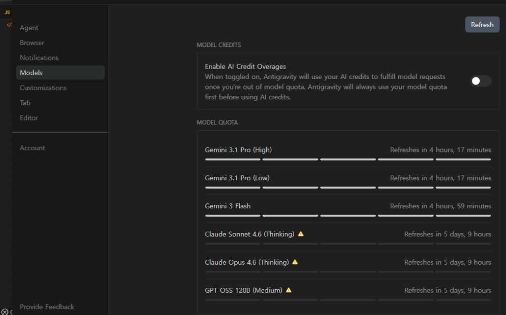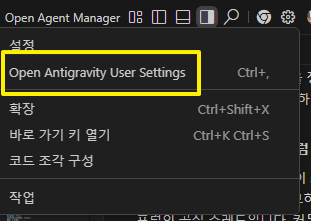 Antigravity의 크레딧 사용량은 다음 메뉴에서 확인할 수 있습니다.
