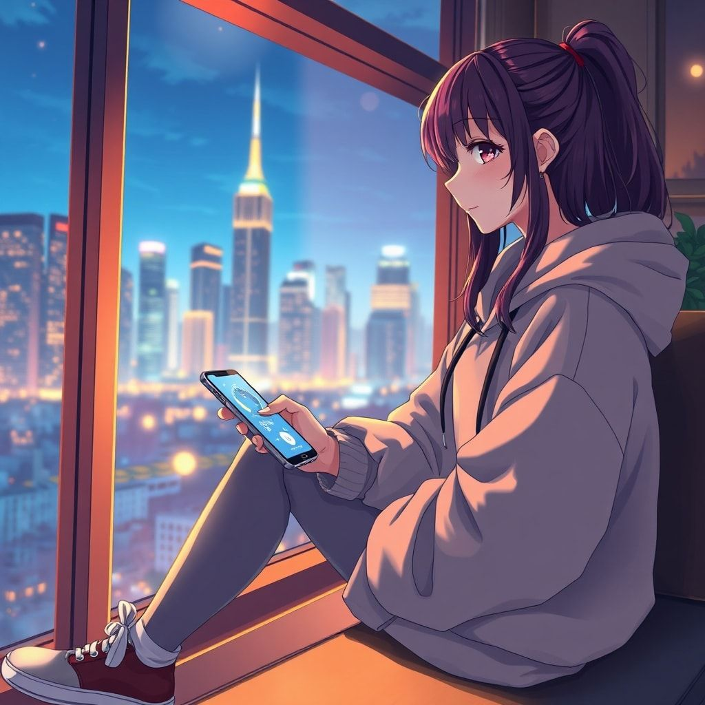 "modern city anime style, a stylish girl in a trendy oversized hoodie "