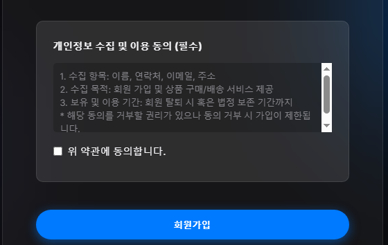 수집 목적, 항목, 보유 기간, 거부 시 불이익 등을 명시하고 사용자가 '동의함'에 체크하게 해야 합니다.