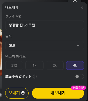 팝업창에서 형식은 Three.js 에서 사용하기 용이하도록 ‘GLB’를 선택해 주세요.