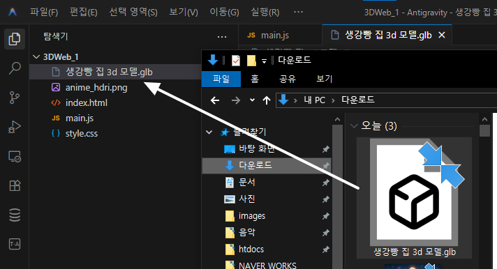 이제 탐색기의 모델 파일을 안티그래비티 프롬프트 창에 드래그합니다.